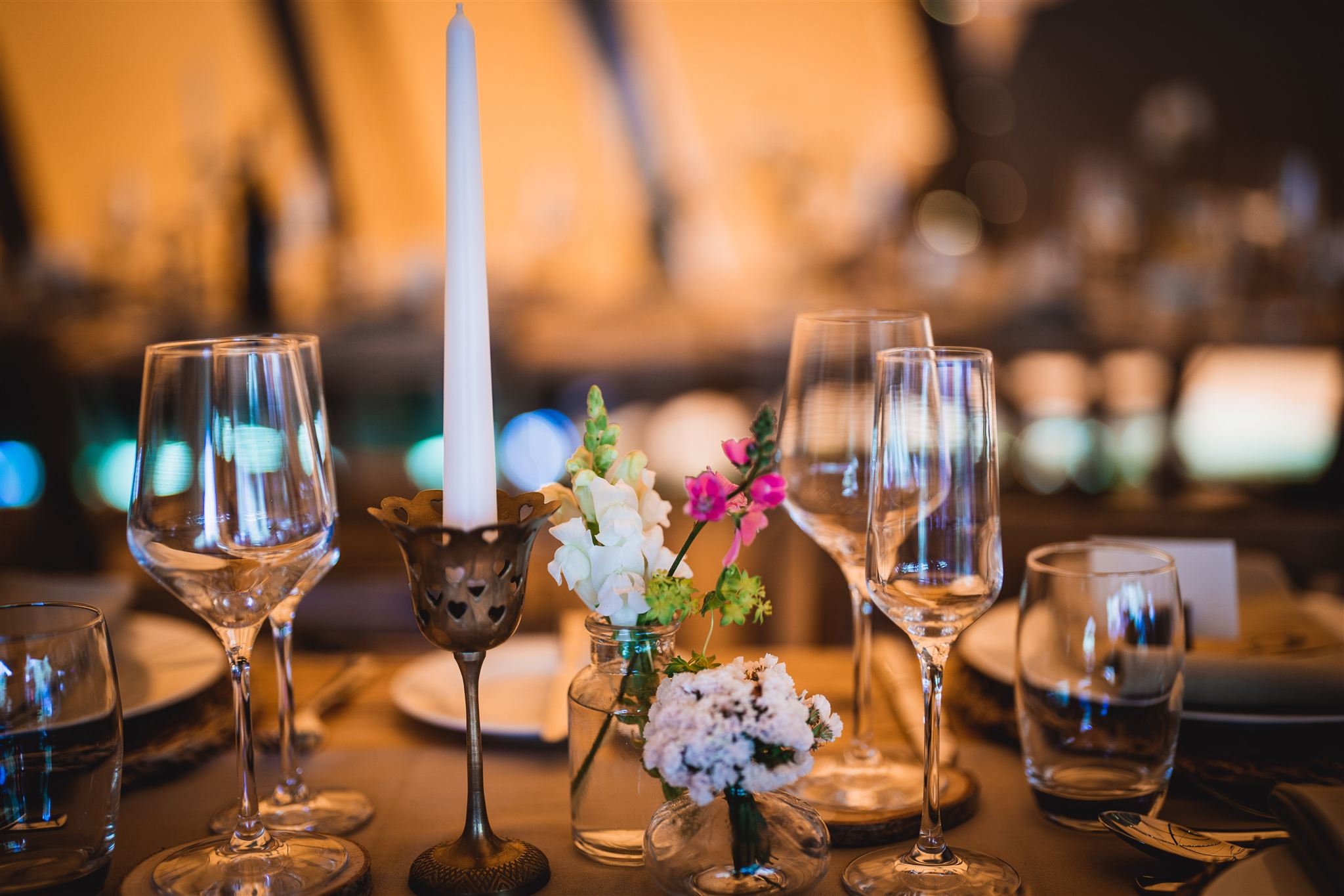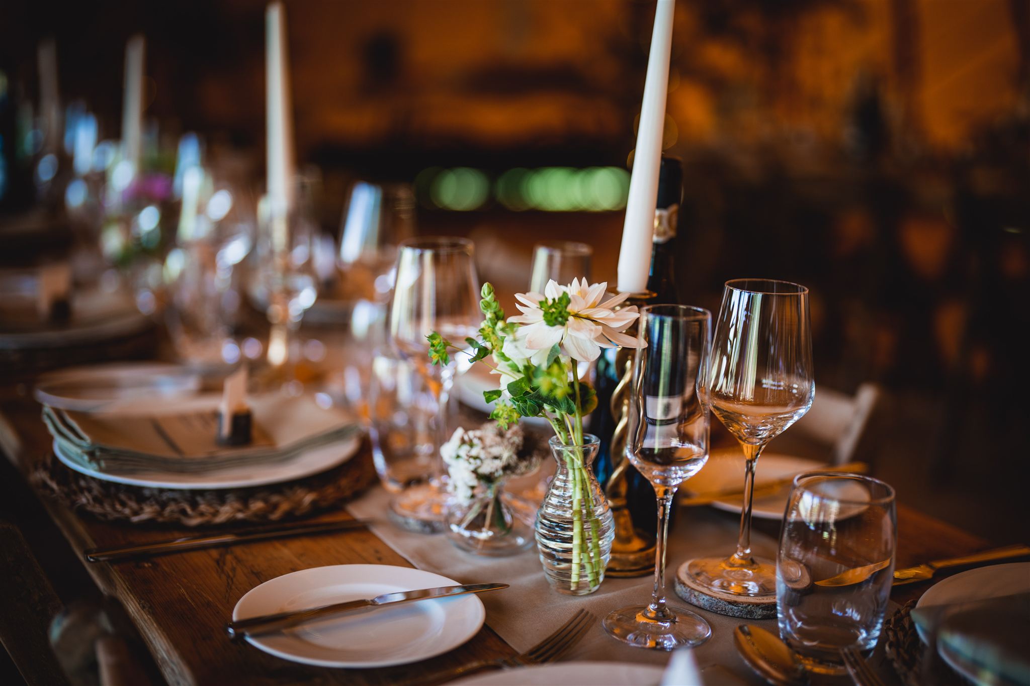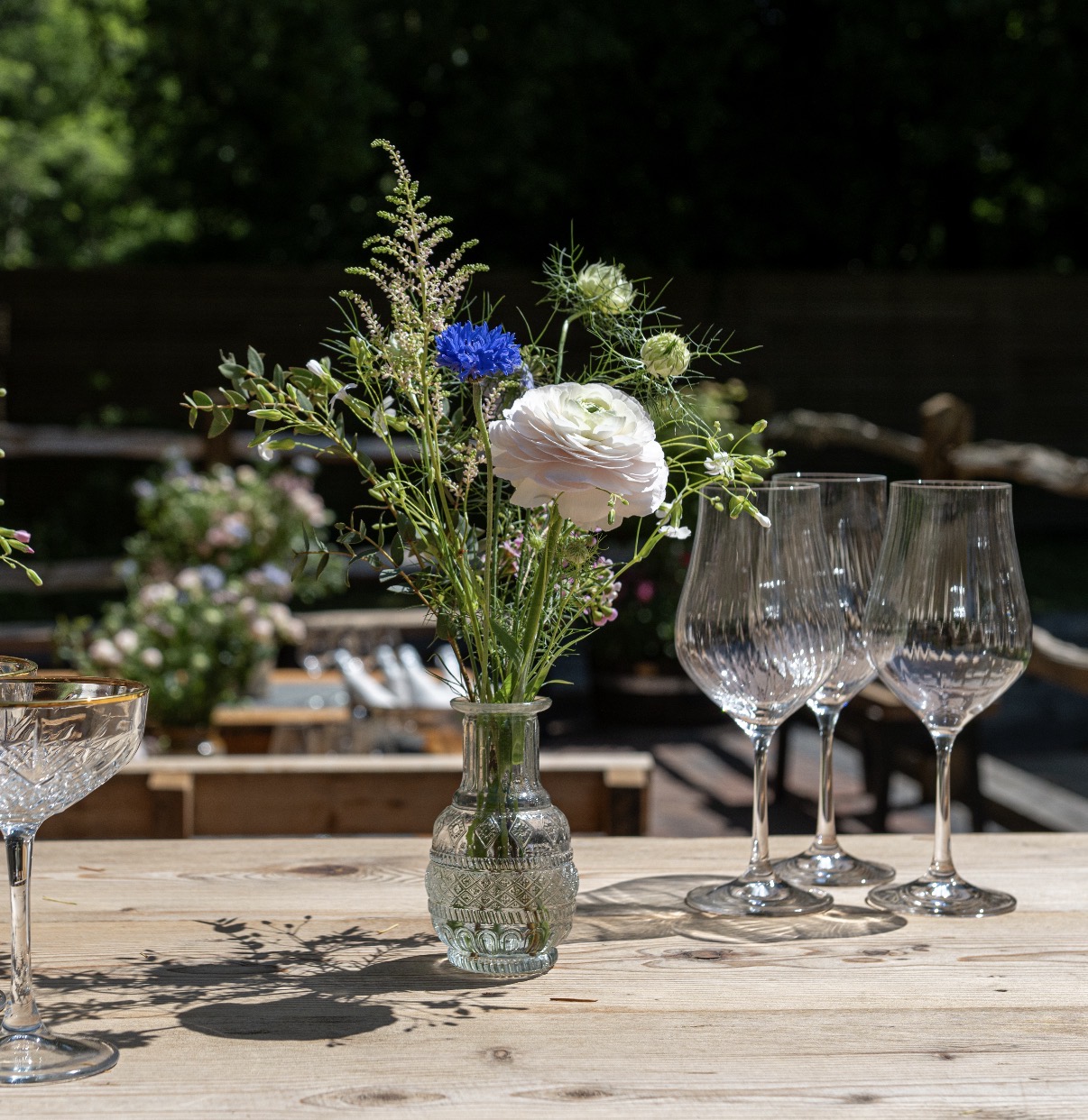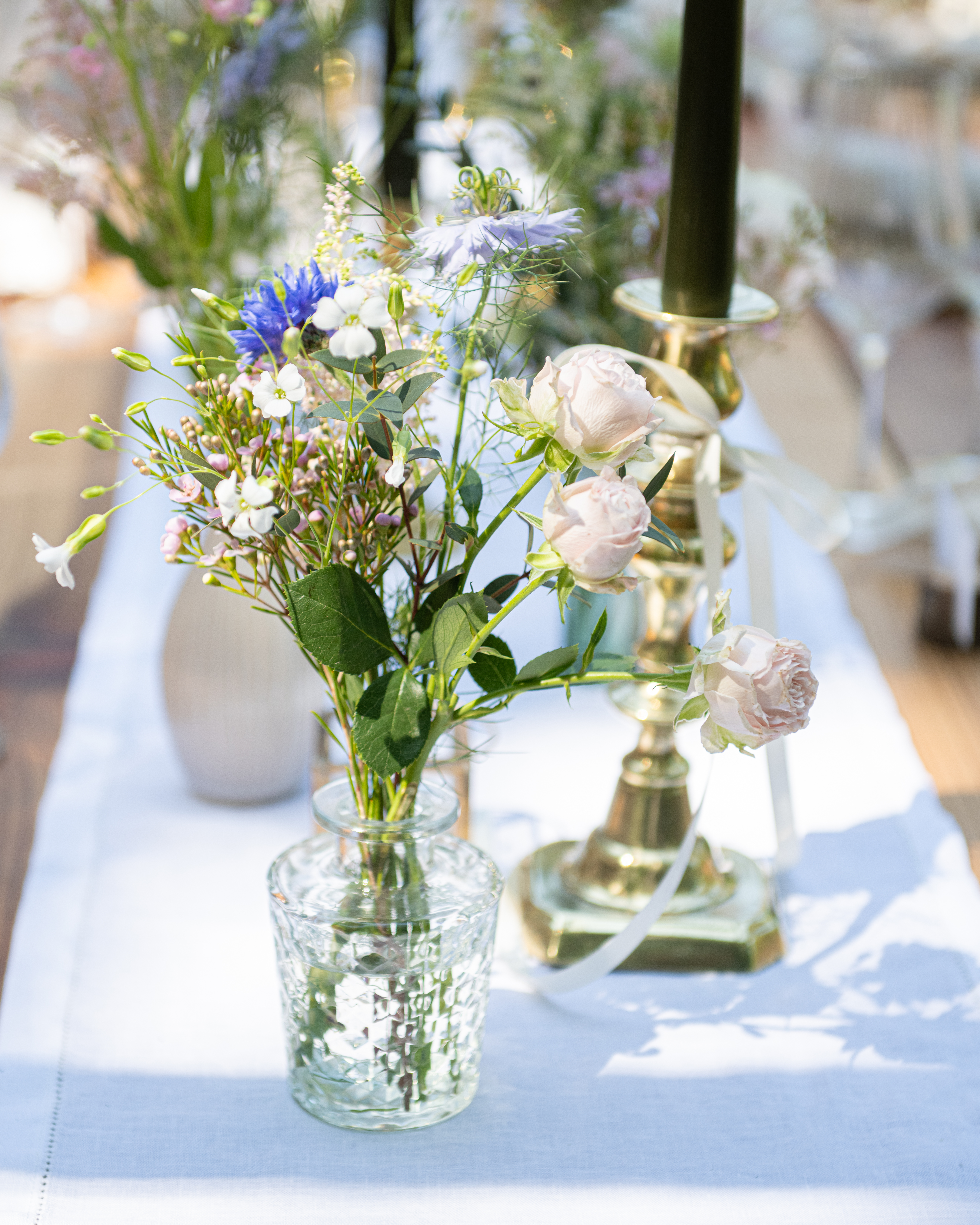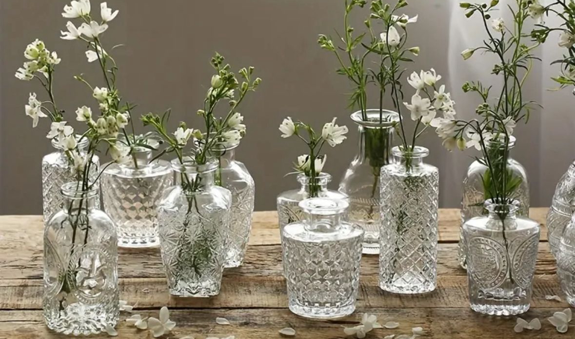 A mixture of glass bud vases, both cut glass and plain. A variety of heights and widths which look beautiful mixed and matched displaying flowers.